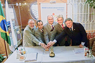 EGD Elói Berti, presidente do RCC Rebouças, governador do Distrito 4730, Romualdo Inckot, presidente Dalton Ortiz e Dionísio Olicshevis, idealizador do clube, tocando o sino para formalizar a fundação do novo clube.